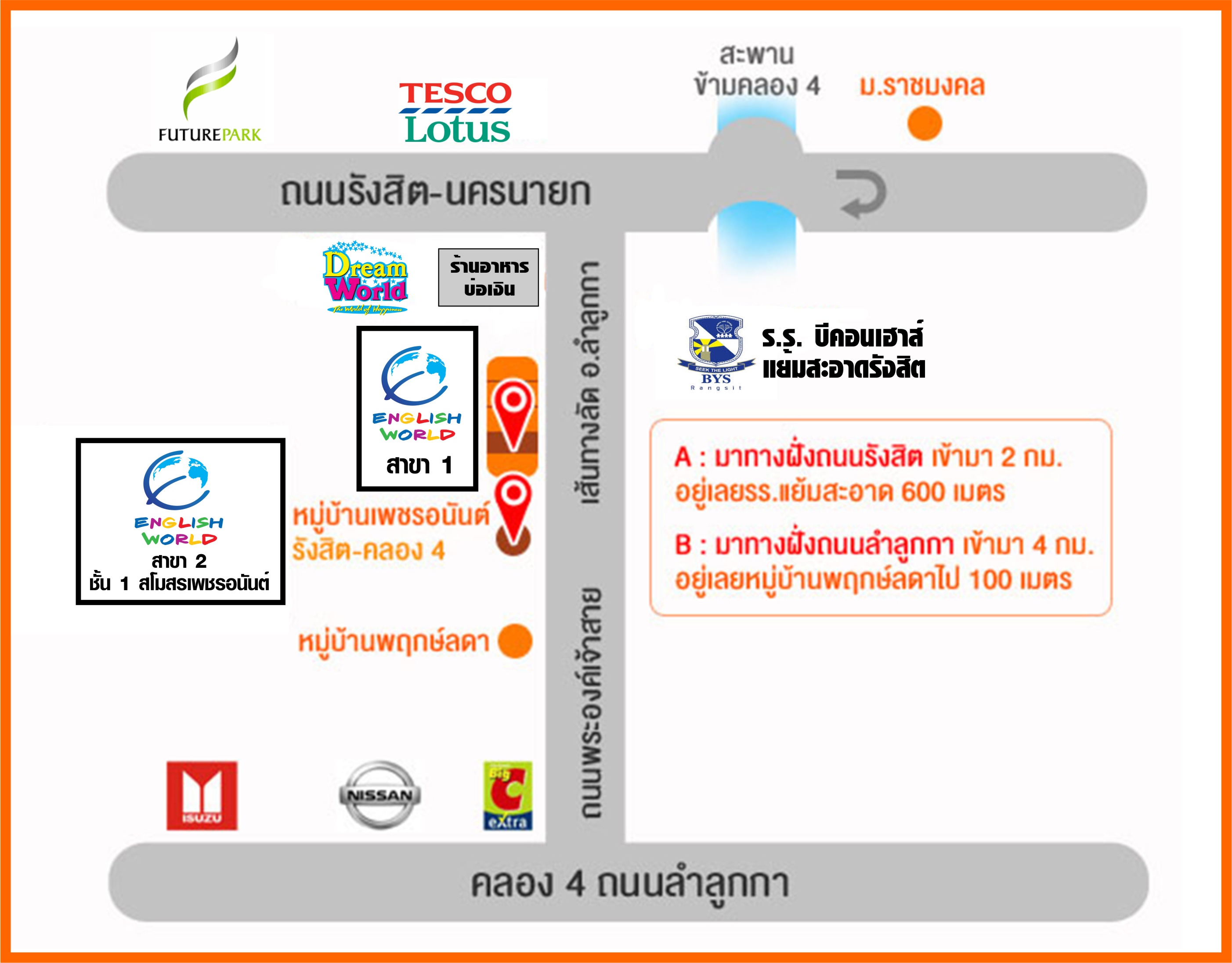 สาขา 1: 4/21 หมู่ 6 ต.ลาดสวาย อ.ลำลูกกา จ.ปทุมธานี 12150 (รังสิต ลำลูกกา คลอง 4 อยู่ห่างจากโรงเรียนบีคอนเฮาส์แย้มสอาดรังสิต 1 กิโลเมตร) สาขา 2: สโมสรหมู่บ้านเพชรอนันต์ ชั้น 1 คลอง 4 ลำลูกกา ต.ลาดสวาย อ.ลำลูกกา จ.ปทุมธานี 12150